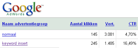 Een veel onderbelichte feature van Google’s Adwords is de zogenaamde “Key Word Insert”. Je kan hiermee de zoektermen laten verschijnen in je Adwords advertentie. In één van mijn campagnes heb ik getest met twee advertentiegroepen: een normale adwords campagne en een ‘keyword insert’ campagne. De CTR van de laatste is bijna 4(!) keer zo hoog! Beide campagnes doen niet voor elkaar onder qua conversie eenmaal beland op de website. Maar hoe werkt dat dan?