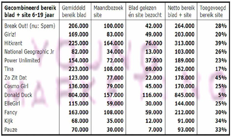 De aard van de titel is ook van invloed. Op jongerengebied is het toegevoegd bereik van de site bij bijv. Jetix Magazine (basis: tv) en Kidsweek (actualiteit) ook groter. Volgens mij zijn vooral degenen die beide media gebruiken interessant; dat versterkt je boodschap nog eens.
