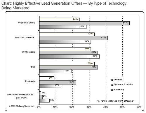 In juni 2006 heeft MarketingSherpa een enquete gehouden onder 1,900 technology marketeers (software, hardware en gerelateerde producten en diensten) waarbij is gevraagd naar de inzet (en budgetverdeling) van diverse marketingkanalen voor leadgeneratie. Weblogs worden daarbij als één van de meest effectieve kanalen voor het genereren van leads genoemd. Als belangrijkste redenen waarom weblogs het bij deze ondervraagden wint van bijvoorbeeld white papers en gratis demo’s is omdat de laatste middelen pas een rol spelen aan het eind van de sales cyclus en de weblog al vroeg in het beslissingstraject van de prospect een rol speelt. Ook het belang van podcasts, webcasts en webinars bij het genereren van sales leads neemt volgens het onderzoek toe.