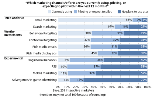 Samen met zoekmachine marketing behoort e-mail marketing tot de bewezen instrumenten. Behavioral en contextual advertising zijn instrumenten die de moeite waard zijn om te onderzoeken terwijl weblogs en RSS zich nog in de experimentele fase bevinden. Dit laatste geldt overigens ook voor mobile marketing en advergaming (of in-game advertsing).