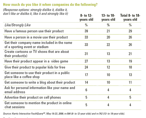 Tom De Bruyne verwijst op i-wisdom (via: Ypulse) naar een onderzoek (pdf) van Harris Interactive Youth naar de do’s en don’ts van adverteren voor jongeren.