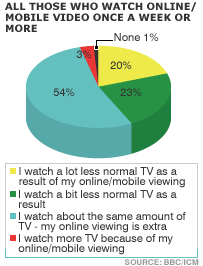 Na de eerdere successen van online video (ook voor adverteerders) waren de reacties uit de TV-wereld nog wat voorzichtig. De veranderde mediaconsumptie gaf een volgende indicatie van de groei van online audiovisuele content. Nu komt de BBC met een onderzoek (uitgevoerd door ICM) over het gebruik van online video. De belangrijkste conclusie: mensen die online video consumeren, kijken minder TV: