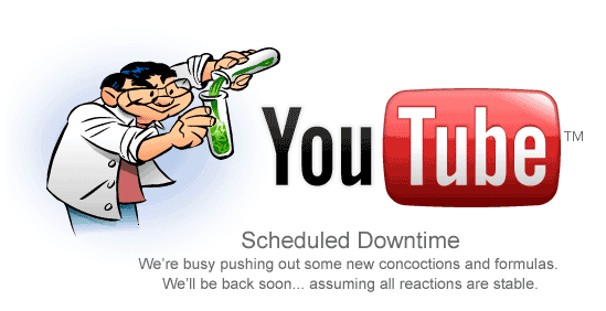 We hebben het al eens eerder gehad over wat je nu als gebruiker mag verwachten van gratis online services zoals in dit geval YouTube. Wat mij in dit geval intrigeert is de tekst die YouTube als foutmelding geeft: “We’re busy pushing out some new concoctions and fomulas. We’ll be back soon… assuming all reactions are stable.” Het zal wel aan mij liggen maar ik begrijp er helemaal niets van. Hebben ze nu een technisch probleem? Een juridisch probleem? Of is YouTube gewoon gehacked? Het zal later op de dag allemaal wel duidelijk worden. Voorlopig zit online tv kijken via YouTube er in ieder geval niet in.