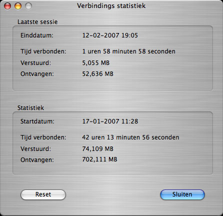 “Ik ben benieuwd wat jouw data slurper op je Mac eigenlijk is.” -> Eén van de redenen waarom ik dat kaartje heb aangeschaft was de intrek van mijn nieuwe kantoortje, vóór KPN het internet had aangelegd (ligt er nog steeds niet, overigens…). En dat dataverkeer is dan ook gewoon ‘normaal werkverkeer’. (Zoals je ook al in de screendump kunt zien, heb ik er ruim 42 uur over gedaan om 700 MB in te laden; da’s dus gemiddeld 4,6 kbytes/seconde).