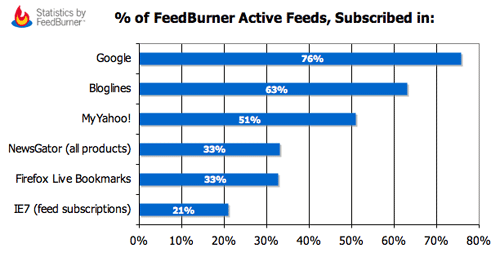 Gisteren publiceerde Feedburner nieuwe cijfers over het RSS-gebruik. Feedburner is wereldwijd één van de meest gebruikte RSS-statistiekenprogramma’s en meet op dit moment ruim 600.000 RSS-feeds afkomstig van bijna 350.000 weblogs, uitgevers en podcasters. Feedburner merkt terecht op dat er verschillende manieren zijn om de populariteit van een RSS-reader te bepalen (aantal abonnees, aantal views of aantal doorkliks). Welke criteria je ook kiest, het is duidelijk dat de kleine spelers steeds meer worden verdrongen door Google, Yahoo! en Microsoft. Het gevecht om de RSS-lezer lijkt definitief te zijn begonnen!