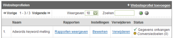 Om te voorkomen dat de nieuwe data over de originele data heen geschreven wordt kun je het beste een nieuw profiel voor de site aanmaken. Op dit profiel zullen dan de nieuwe filters toegepast worden. Noem het profiel bijvoorbeeld “Adwords keyword meting” zodat direct duidelijk is dat data in deze rapportage gefilterd word. In onderstaande afbeelding staat rechtsboven de link om een nieuw profiel te kunnen toevoegen.