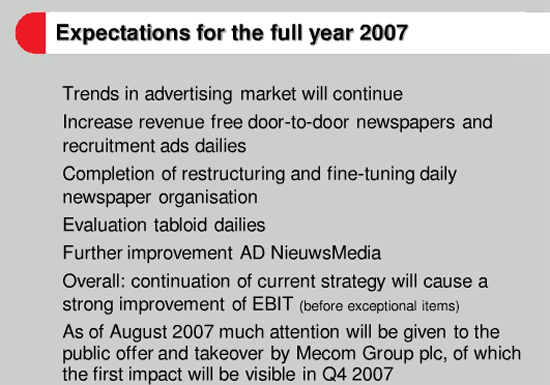 Opmerkelijk is dat bij de verwachtingen voor de tweede helft van het jaar (waarin men verwacht dat de trends uit het eerste helft van dit jaar zullen doorzetten) geen aandacht is besteed aan de ontwikkelingen op het gebied van internet. Bij de presentatie van de jaarcijfers over 2006 melde Han van den Berg, manager Strategie bij Wegener, nog dat dorpspleinen, regioportalen en iLocal speerpunten van Wegener worden. We zijn inmiddels een half jaar verder en het kan aan mij liggen maar ik hoor of zie weinig van de dorpspleinen en iLocal. Iemand?
