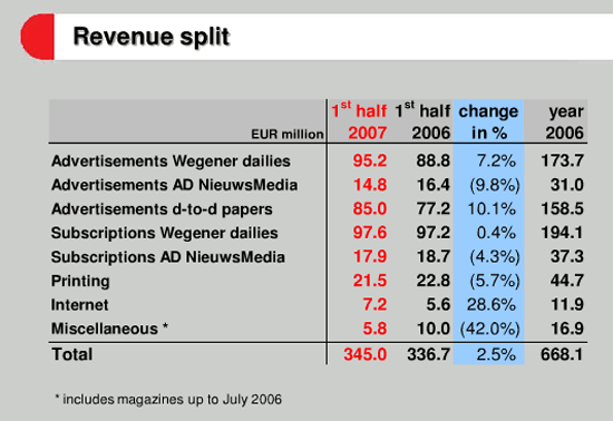 Het eerste dat opvalt is dat internet van alle bedrijfsonderdelen van Wegener de grootste toename in omzet laat zien (+28,6%). Absoluut gezien is internet echter nog steeds een klein onderdeel. Met 7,2 mln euro in het eerste half jaar van 2007 maakt het slechts 2,1% uit van de omzet.