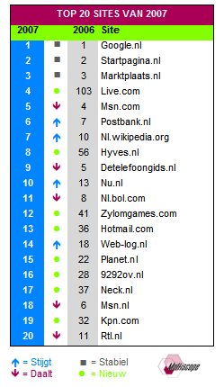 Voor het achtste achtereenvolgende jaar heeft online onderzoeksbureau Multiscope weer de ranglijst opgesteld van de best bezochte Nederlandse sites. Evenals vorig jaar staat Google.nl op nummer 1 gevolgd door Startpagina.nl en Marktplaats.nl. Google heeft daarbij het gat met startpagina vergroot door te groeien naar 11 miljoen bezoekers per maand, 4 miljoen meer dan startpagina.nl.