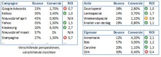 Voorzie rapportages op het laagste niveau (per link, per banner) ook van een bounce rate en conversieratio. (Voor degenen met de geavanceerde pakketten kunnen we hieraan toevoegen: average time spent, customer lifetime value, product view ratio, etc.)