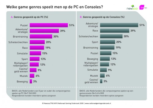 Maar wat zijn nu de populairste games onder die enorme groep van 8 miljoen Nederlanders? Antwoord: puzzelgames. Op de tweede plaats: adventure/strategie games met 39 procent, gevolgd door braintraining games met 30 procent. Pas op de vierde plek (20 procent) volgen de games waarin gevochten of geschoten wordt (deze worden met 48 procent het meest gespeeld door consolegamers).