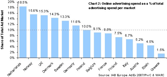Europa verkleint daarmee de kloof met de VS waar de markt in dezelfde periode met 26% groeide, tot 14,5 miljard euro. Twee derde van de Europese onlinereclamebudgetten werd uitgegeven in de drie grote markten: UK (3,8 miljard euro), Duitsland (2,5 miljard euro) en Frankrijk (1,0 miljard euro). In Nederland namen de online mediabestedingen in 2007 toe tot 729 miljoen euro (+29%). Daarmee staat Nederland op de vierde plaats in Europa, voor landen als Italie en Spanje. De groei was het grootst in enkele kleinere markten, zoals Griekenland (+91%) en Slovenië (+49%).