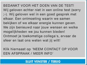 Op de site is ook een test te vinden of je bij de cultuur past. De eerste vraag is wat voor soort dienstverband je zoekt: vast, part-time, mid-lance of flexibel. Ik ben verbaasd, als ik dus part-time werk ben ik niet in vaste dienst? En wat is in hemelsnaam ‘mid-lance’, en hoe als ik dus part-time werk kan ik niet flexibel werken?