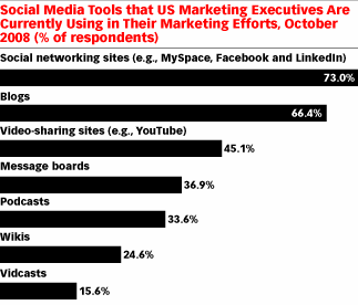 ‘Good for product reviews, not so good for bargain hunting.’ Dat is de soundbite waarmee ze bij eMarketer een nieuw onderzoek van Marketing Executives Networking Group (MENG) typeren. Meer dan tweederde van de ondervraagde marketing beslissers in de VS zegt in oktober van dit jaar blogs in te zetten voor marketingdoeleinden. En hoewel iedereen hijgt over de inzet van social networks, blijken blogs nog steeds belangrijk in de marketingmix. Zie onderstaande tabel: