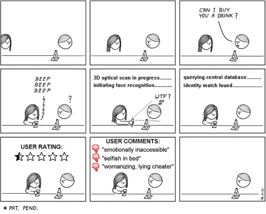 Fantastische strip! Haha. Sneue is dat dit geen fictie is en zelfs geen toekomstmuziek. Face recognition zit al in software en het is alleen een kwestie van wachten tot zoekmachines dit gaan aanbieden. Ik kijk niet vreemd op als een zoekmachine het bij wijze van spreken volgende week lanceert.