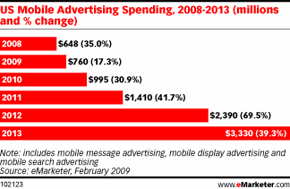 Ja, het gebeurt nu echt. Er is geen ontkomen meer aan. Mobile advertising zit in de lift en de omzet gaat exploderen. Even wachten, nóg even wachten. Nog éven wachten: in 2013 zitten we op 3,3 miljard dollar. En we komen van 648 miljoen dollar in 2008. eMarketer koffiedikt wel eens vaker, maar is doorgaans goed ingevoerd.