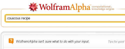 Als ze nou nog een kaartje hadden gepresenteerd met de landen waar couscous veel gegeten wordt, had ik die landen in Google kunnen gooien. “recept Marokko” ofzo (deze zoekopdracht levert me daadwerkelijk een hoop relevante recepten, dank je Google). Maar “couscous recipe” levert in Wolfram de volgende melding op: