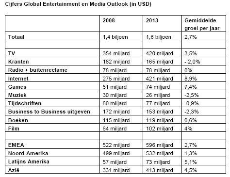 Consumenten gaan vooral meer geld uitgeven aan digitale tvabonnementen, internet en games, terwijl de bestedingen in de kranten-, tijdschriften en muziekbranche verder teruglopen. Ook de advertentie-inkomsten zullen de komende twee jaar sterk dalen. Er zal gemiddeld respectievelijk 12,1 procent en 2,7 procent minder worden uitgegeven aan reclame-uitingen.De verwachting is dat in 2013 de totale inkomsten van de entertainment- en mediasector 1,6 biljoen USD zal beslaan. Dit is nog steeds 200 miljard dollar meer dan nu, maar wel minder dan de voorspelling van vorig jaar. De negatieve tendens zal in 2011 doorbroken worden.