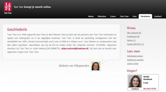 De openheid en persoonlijkheid geeft de site een warm gevoel. In de geschiedenis staat de omzet genoemd en verder: alle cijfers zijn openbaar voor klanten en medewerkers. Kijk, dat is helder, open en eerlijk. Ook het feit dat op de hele vacature site elke keer de naam, het telefoonnummer en het e-mail adres met een foto van de recruiter wordt genoemd is een persoonlijke touch die je lang niet overal tegenkomt. De uitstraling van Tam Tam door het allemaal zo persoonlijk te maken en aan te geven wat van wie afkomstig is (op een visueel aantrekkelijke manier) geeft een warm gevoel.