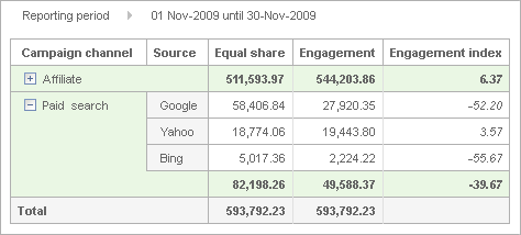 Sitestat heeft een systeem ontwikkelt (de Engagement index) waarmee je punten toe kunt kennen aan acties van een bezoeker. Wanneer bijvoorbeeld een bezoeker zich inschrijft voor je nieuwsbrief geef je hem 10 punten, bij elke productdetail pagina 1 punt en bij het printen van een pagina 5 punten. Op basis van de behaalde punten in een bezoek krijgt de campagne die voor dat bezoek gezorgd heeft dan een aandeel in de winst. Op deze manier geef je bezoeken waarin veel belangrijke interactiviteit plaatsgevonden heeft ook meer krediet bij het afrekenen van je campagnes: