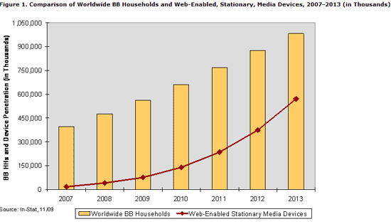 In een eerder deze week gepubliceerd rapport van In-Stat (onderdeel van Reed Elsevier) stelt het gerenommeerde Amerikaanse marktonderzoeksbureau, dat er binnen 3 jaar wereldwijd meer dan 500 miljoen consumenten electronica producten met een netwerk of internet – aansluiting, in de markt zullen staan. Hierbij moet men dan denken aan o.a. settop boxen, DVD- en media spelers, PVR’s en DVRs, digitale TV’s, Blu-ray spelers en game consoles. Op dit moment beschikt wereldwijd één op de vijf breedband huishoudens over tenminste één zo’n apparaat met internet connectie, terwijl dat in 2013 zal gelden voor de helft van alle breedband huishoudens in de wereld.