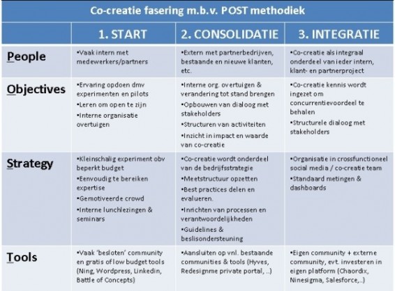 De ommezwaai van de interne cultuur doe je niet zomaar. Hier zijn aan de hand van het model van Open Innovatie Service Provider NineSigma 3 stappen in te onderscheiden: de start (launch), consolidatie (consolidate) en integratie (embed) fase. Aan de hand van de POST methodiek van Forrester wordt per stap aangegeven welke co-creatie activiteiten er kunnen plaatsvinden om co-creatie in de organisatie te implementeren (zie tabel onderaan).