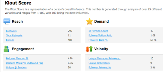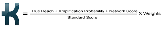 Een vergelijkbare tool is Klout die de invloedsfeer van iemand op twitter uitdrukt in een zogenaamde Kloutscore. De score, uitlopend van 1-100, geeft de mate aan waarin iemand andere kan beïnvloeden en wordt op basis van onderstaande formule bepaald aan de hand van meer dan 25 variabelen waaronder followers, hoe ver jouw tweets reiken op twitter, verhoudingen followers/following, mate van retweets etc.