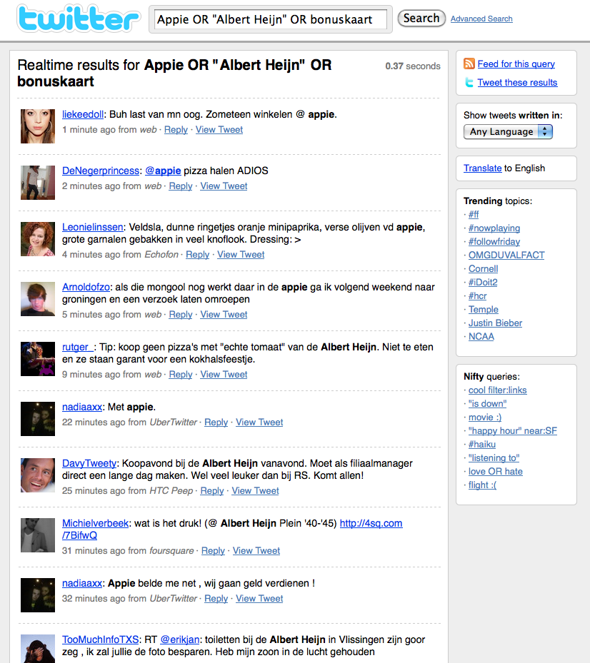 Door de eenvoudige interface en de focus op de Nederlandse markt zeker een tool die je helpt te luisteren naar wat er over je bedrijf wordt gezegd, mits er onder de motorkap nog wel wat gesleuteld wordt door de ontwikkelaars. Zoeken op Albert Heijn of “Albert Heijn” of Albert+Heijn levert of niets op of resultaten met de nodige vervuiling en bijvoorbeeld buitenlandse tweets.