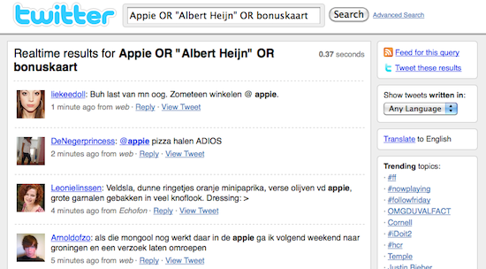 Hoewel onderschat en vaak ook ongemerkt al gebruikt, biedt RSS leuke mogelijkheden om op eenvoudige wijze social media te monitoren. Open allereerst een gratis RSS-reader account bijvoorbeeld bij Google Reader. Daarna ga je op zoek naar RSS-feeds die voor jou relevante uitingen in de social media in je reader tonen. De eerste feed die je kunt gebruiken is een feed die alle tweets met voor jou relevante woorden toont. Hiervoor ga je naar search.twitter.com en voert daar voor jouw bedrijf relevante keywords in. Zo levert als zoekopdracht: Appie OR “Albert Heijn” OR bonuskaart tweets op met deze woorden die voor iemand bij Albert Heijn (of de concurrent) interessant kunnen zijn.