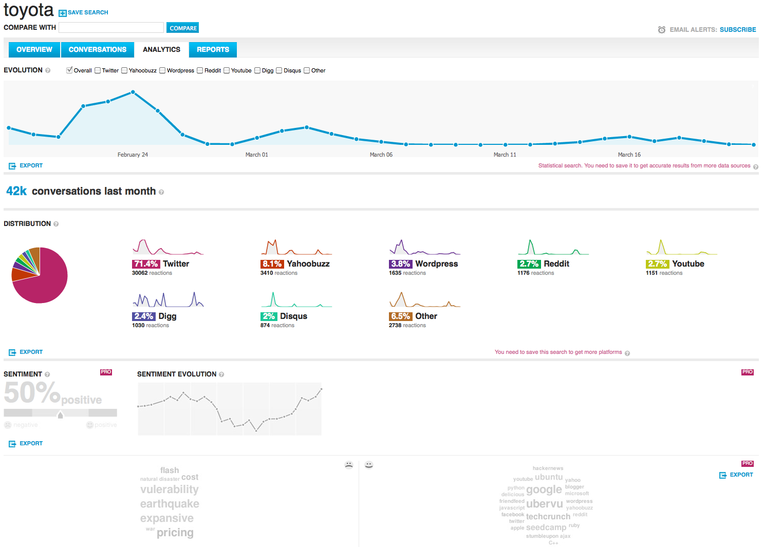 Realtime (nou ja bijna realtime) wordt het web gevolgd en heb je inzicht middels een social media dashboard. De analytics-kant wordt op simpele maar krachtige wijze weergegeven inclusief het sentiment. En niet alleen mentions over jouw bedrijf of product worden gegeven maar ook de commentaren daar weer op. Je kunt alerts instellen voor email of RSS en hebt tot slot inzicht in de historie zodat je ook goed het verloop in tijd kunt monitoren.