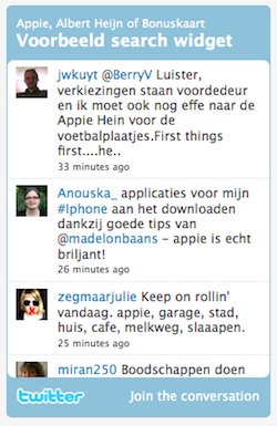 Widgets zijn klein handige schermpjes die je kunt opnemen op een internetpagina zoals bijvoorbeeld een blog of een intranetpagina. Misschien een wat vreemde eend in de bijt in dit artikel, maar onderschat niet de kracht van een widget op intranet die alle medewerkers direct confronteert met wat er in de social media over het bedrijf wordt gezegd. Widgets kunnen je op eenvoudige wijze helpen je organisatie bewuster te maken van de social media en te starten met luisteren.