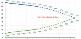 “We are just at the beginning of a new wireless era where smartphones will become the standard device consumers will use to connect to friends, the internet and the world at large.” Bij Nielsen koffiedikken ze er tegenwoordig ook op los op basis van voorgenomen koopintenties. Eind 2011 kruisen de marktaandelen van de smartpone en de feature (gewone) telefoon elkaar in de VS. Uiteindelijk zal het marktaandeel van de smartphone, zo blijkt uit onderstaande voorspelling, doorgroeien en dominant worden, het aandeel van de feature phone zal verder afkalven: