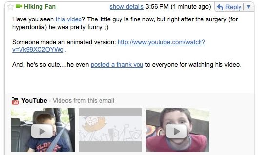 Sinds kort staat de functionaliteit voor het automatisch tonen van een YouTube video-preview standaard aan in GMail. Voorheen was dit nog een functie die de gebruiker zelf apart in GMail Labs aan moest zetten, dat is nu niet meer nodig. Deze functionaliteit zorgt ervoor dat GMail in een e-mail detecteert of er een link naar een YouTube-video in staat: zo ja, dan wordt onder de e-mail zelf een kleine preview van de video (of meerdere video’s) getoond. Met een klik op de knop zal de video dan gaan afspelen in de originele resolutie inclusief geluid. Hiervoor zijn in de e-mail zelf verder geen speciale codes nodig: het is voldoende om een link naar een YouTube-video in de e-mail te hebben staan om de video-preview te activeren.