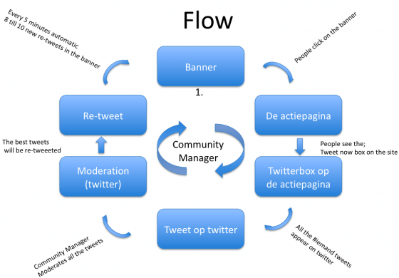 Wanneer een bezoeker vanuit de twitterbox een tip tweet, wordt hier automatisch de hashtag #iemand aan toegevoegd. Is de tip dusdanig interessant, dan wordt deze door de Nuon community manager gere-tweet via het kanaal ‘@NuonEnergie’. Hierna verschijnt de tweet om de 2/3 minuten automatisch in de banner.