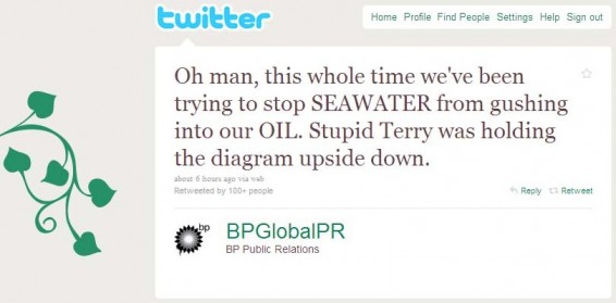 “With millions spent on PR, crisis communications management, brand management, reputation management, how did an enterprising joker on twitter manage to fly under the radar for a week now, in plain view, using BP’s own name and logo? How? BP, are your PR and communications experts purposely blowing this off, or do they not understand how much their job has changed since 1995?”
