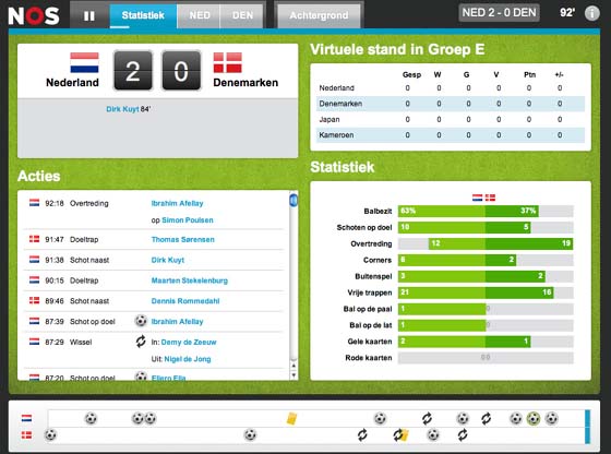 Hoera, we hebben gewonnen, suffe Denen. Tijd voor wat cijfers, voor nerds of ‘technisch geïnteresseerden’. Het ‘virtuele stadion’, zoals de NOS het noemt in het persbericht, heeft sinds vanmorgen negen uur in totaal al 522.000 unieke bezoekers ontvangen. Op het hoogtepunt werden ruim 120.000 gelijktijdige live-streams van Oranjes eerste WK-wedstrijd vanmiddag ‘uitgeserveerd’. Hiermee sneuvelde het oude record van 20 augustus 2008.