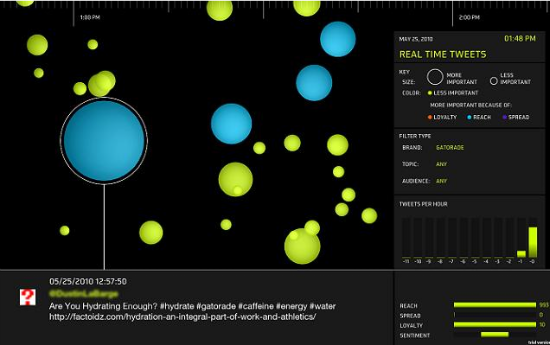 Zes monitoren tonen dashboards met realtime data visualisations die Gatorade samen met Radian6 heeft opgezet. Nu heb je weinig aan prachtige tools liggend in de gereedschapkist, maar de output van het Mission Control leidt ook daadwerkelijk tot aanpassingen in marketing of producten: