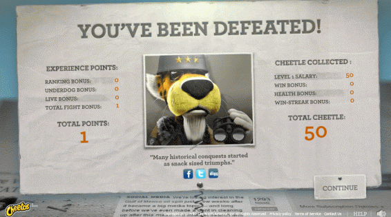 Cheetos heeft sinds vorige week de nieuwe webgame Battle of the Cheetos online gelanceerd. De game heeft veel weg van de bekende Worms serie en is van hoog niveau, zeker voor een webgame. Het leuke is dat je als speler kunt kiezen uit verschillende websites als “Battleground”, die de ondergrond vormen voor de veldslagen die je live kunt voeren tegen andere spelers. De websites die hier aan meedoen, zijn Kotaku, Digg, Mashable, Break, Gawker, AddictingGames, Gizmodo en BoingBoing.
