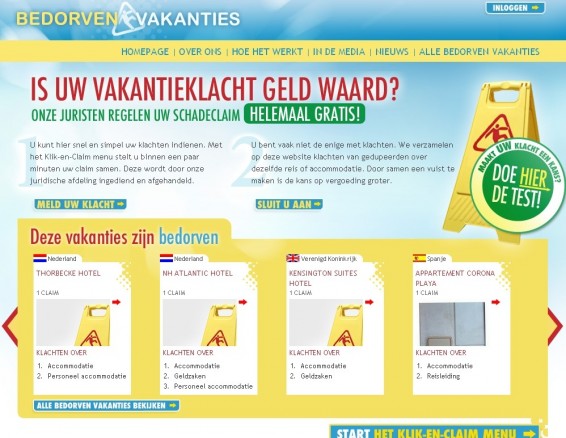 Een splinternieuwe website is onlangs gelanceerd: Bedorven Vakanties. Iedereen kent het tv-programma met Alberto Stegeman wel, die vakantiegangers met problemen helpt. Deze site doet daar iets laagdrempeliger nog een schepje bovenop. Via het klik-en-claim menu op bedorvenvakanties.nl kunnen gedupeerden in een paar simpele stappen hun vakantieklachten indienen. Deze klachten worden op juridische wijze aangepakt en er wordt een schadevergoeding geëist bij de verantwoordelijke reisorganisatie. Bedorven Vakanties werkt hiertoe samen met een advocatenbureau. Laten we deze website even onder de loep nemen. De site is bedacht door Eigen & Wijze Communicatie in Leeuwarden.