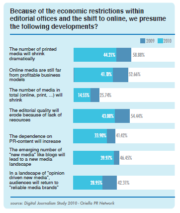 “[…]concerns about the viability of journalists’ “traditional” media channels (print, radio or television) have intensified. When asked about the future of their respective publications, over half of those polled believe that these channels may well fold and be taken off the market (note: no timescales were specified in the responses). This is a sharp rise from last year when only one in three journalists surveyed believed this would happen. Nearly one in six confirm this has already happened to their publication.”