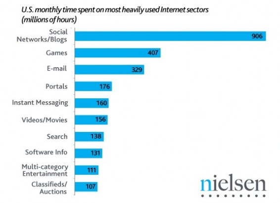 Veertig procent van de tijd die Amerikanen online besteden gaat op aan slechts 3 activiteiten: social networking, spelletjes spelen en e-mailen. Dat blijkt uit nieuwe data van Nielsen. Gemiddeld besteedden de Amerikaanse internetgebruikers 22,7 procent van hun tijd online aan social networks, met e-mail zijn ze nu gemiddeld 8,3 procent van de tijd bezig. In juni 2009 was dit nog 15,8 tegen 11,5 procent. Online gaming hapt 10,2 procent van de tijd weg, een stijging van 10 procent met een jaar geleden. “Email Loses Luster”, tussenkopt Nielsen: