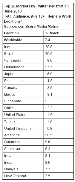 Met dit artikel nog vers in het geheugen: onderzoek van comScore wijst uit: in juni 2010 bezochten ongeveer 93 miljoen internetgebruikers Twitter.com, dat is een groei van 109 procent met het jaar daarvoor. Uit het wereldwijde onderzoek blijkt, dat Indonesië tekent voor de hoogste penetratie met 20,8 procent, gevolgd door Brazilie en Venezuela. Nederland staat met dit onderzoek op de vierde plaats met 17,7 procent. Belangrijk om hierbij op te merken: het gebruik via Twitterdiensten als TweetDeck is niet meegeteld in het onderzoek (tip via: @erwinboogert).