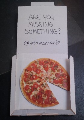 De Amsterdamse reclamewereld was gisteren onverwachts zelf het slachtoffer van een kleine promotiestunt. Bij alle grote online-, media- en communicatiebureaus werden namelijk pizza’s bezorgd van ene @VitoMancante. En alhoewel de meeste bureaus wel gewend zijn aan ludieke acties, werd gisteren toch vooral verbaasd gereageerd op de gratis aangeboden lunch. ‘Is dit een viral of zo?’