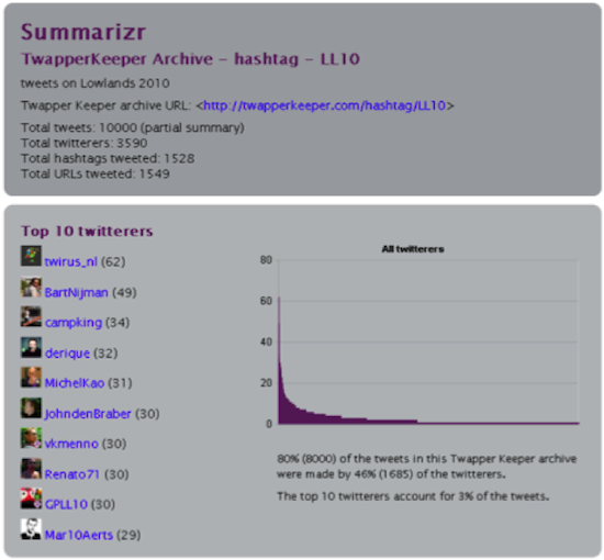 Al met al verwacht ik dat er veel meer getweet is dan hierboven vermeld. (vraag anders de gegevens van lowlands.nl even op, zij hebben alle tweets geinventariseerd om te gebruiken in de mashup die nu op de site staat!).