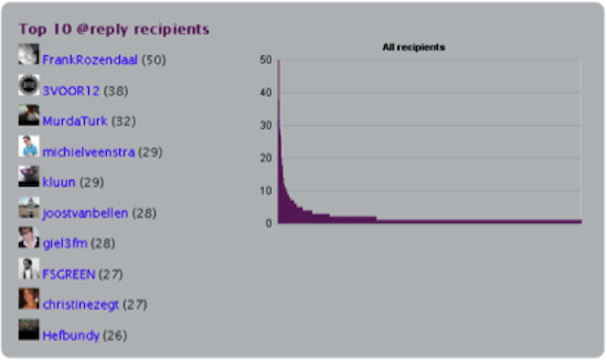 Overigens weet ik bijna zeker dat bovenstaande getallen niet kloppen. Wanneer ik zoek in twapperkeeper (het archief wat hier gebruikt is), kom ik zelf niet eens voor in de gegevens, terwijl ik zeker 20 berichten heb gestuurd. Helaas lijkt er wat mis te zijn met search.twitter.com, want ook daar kan ik geen tweets van mezelf vinden (heb geen slotje).