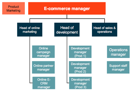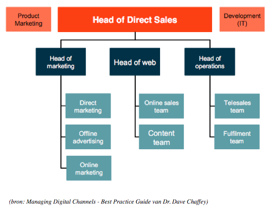 Functionally-based: een apart e-team voor online marketing/e-communicatie, ontwikkeling en sales en operations.