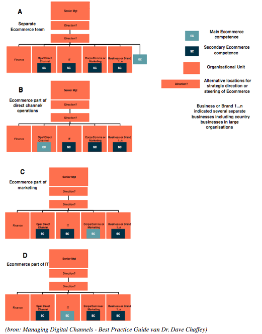 Uit onderzoek van dezelfde Dave Chaffey (2008) is tevens gebleken dat de locatie van de e-business functie sterk van bedrijf tot bedrijf verschilt, maar dat e-business bij de meeste bedrijven onderdeel uitmaakt van marketing (44%). Bijna 25% richt een apart team in en 11% doet dit via het direct kanaal. Een algemene onderverdeling volgens Chaffey voor de locaties waarin e-business wordt ondergebracht verdeeld is de volgende:
