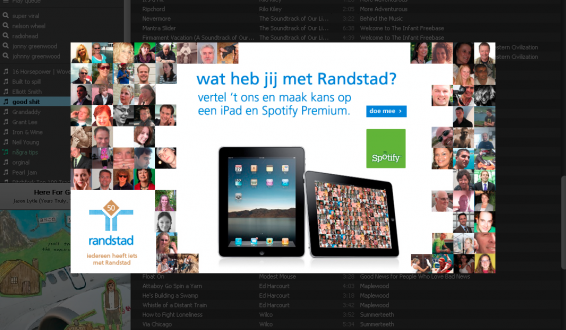 Ik vind dat Randstad dit slim toepast; het past in hun gehele campagne. En de ‘disruption’ is kortstondig en niet storend! Ze roepen op om te delen wat je met Randstad hebt; doe je dit dan maak je kans om een iPad te winnen. Wie wil dat nou niet in de doelgroep waarop zij mikken? De link met Spotify is dat je ook nog een Spotify jaarabonnement kan winnen door jou ‘Wat heb ik met Randstad’ moment te delen. Binnen de context van muziek luisteren via Spotify is dit laatste het meest relevant denk ik en een mooie beloning als je besluit mee te doen met deze actie.