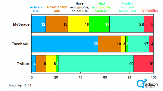 Een derde van de jongeren gebruikt radio streams als een manier om nieuwe muziek te ontdekken. Het kopen van cd-albums daalt drastisch onder deze groep maar het aantal jongeren dat muziek download is sterk toegenomen. De jongeren waren niet te beroerd om toe te geven dat ze dat downloaden nogal eens illegaal doen. Televisie heeft de dominante positie in het ochtendritueel voor mediagebruik overgenomen van radio. Jongeren vinden en vonden dat er in de ochtend en in het algemeen teveel reclame is op de radio. Edison vroeg trouwens ook naar het gebruik van social networks (pagina 33):