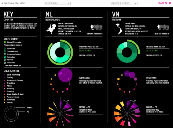 Maleisië is koploper: gemiddeld 9 uur per week is de internetter daar actief in sociale netwerken. Rusland (8,1 uur per week) en Turkije (7,7 uur per week) zijn de nummers 2 en 3. De Nederlandse internetter blijft daar ver bij achter: 2,3 uur per week. De internetter in Maleisië heeft het grootste aantal online vrienden: 233 gemiddeld. Brazilië volgt op de voet met 231. Japanners zijn online het minst sociaal: slechts 29 vrienden gemiddeld voor elke internetter. Nederlanders zijn middenmoters, met gemiddeld 116 vrienden. De Chinezen, die toch veel tijd spenderen aan sociale netwerken, houden er verrassend weinig online vrienden op na: slechts 68. Warmelink: